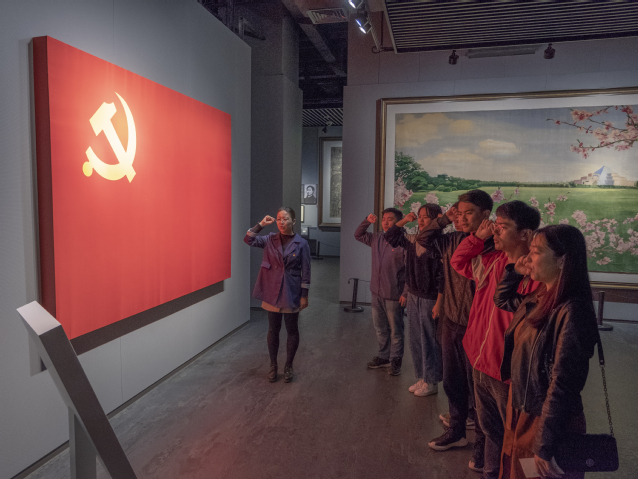 参观过程中,钟旭芬老师带领学生党员重温入党誓词。在鲜红的党旗下,全体党员佩戴党徽,庄严宣誓。