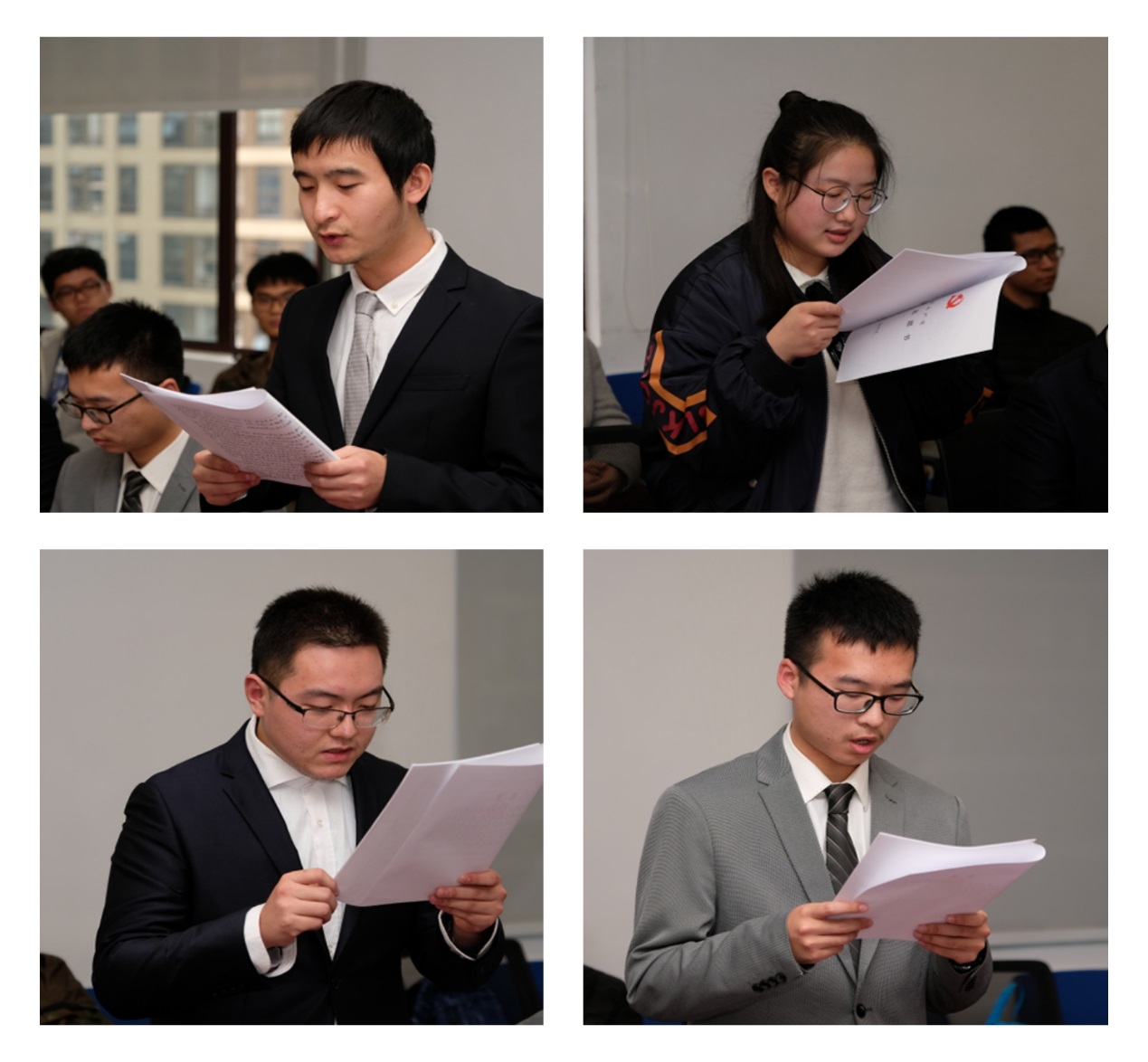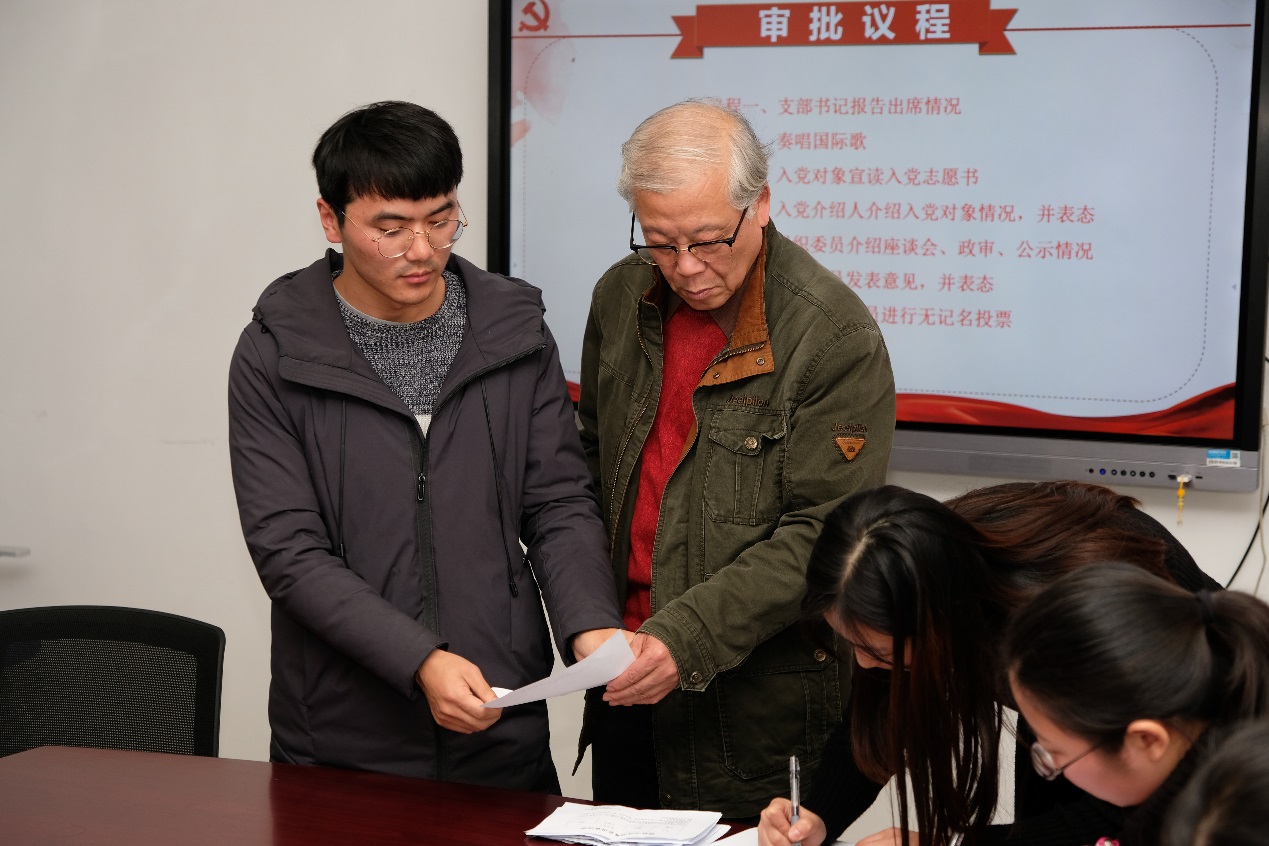 会议在激情昂扬的国际歌声中拉开帷幕,在庄严的党旗下,四位发展对象依次宣读了入党志愿书,他们就入党动机、培养期间党章学习、自身表现以及缺点等方面向党组织作了深入汇报,并表达了坚定的入党决心。入党介绍人就发展对象在思想、学习、工作、生活等方面的表现进行了介绍,同时指出其不足之处及努力方向,并是否同意发展对象入党进行了表态。学生党支部宣传委员付艳君介绍了四位发展对象座谈会、政审及公示情况。会上支部教师和学生党员依次逐个指出发展对象的现存不足及努力方向。经大会无记名投票和表决,10名有表决权的正式党员一致同意接收顾磊、张学衡、姚顺、胡明理这四名发展对象为中共预备党员,全票通过。