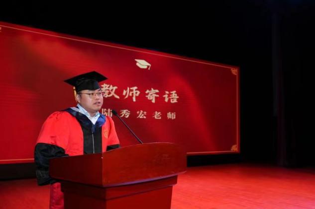 陆秀宏老师作为教师代表向毕业生们送上最真挚的祝福。作为老师,也作为朋友,他送给了同学们几句话,希望同学们笔耕不辍,继续学习;坚守初心,追寻梦想;面对现实,脚踏实地。这四年大家学习不易,在学药这条路上,老师将与同学们一起并肩同行。