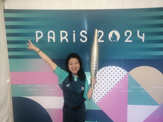 沈蝶衣身穿志愿服,与奥运火炬合影