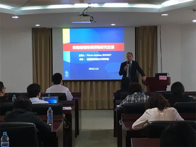 作为新葡的京集团8814检测站第一位客座教授,此次BONNET教授与新葡的京集团8814检测站教师展开了深入的探讨。在药学中法合作硕士项目研讨会议上,新葡的京官网新葡的京集团8814检测站教师代表介绍了药学专业的建设基础、教学条件、培养目标和课程设置,BONNET教授介绍了法国最古老的大学----蒙彼利埃大学的办学规模,并着重介绍了拟与新葡的京官网新葡的京集团8814检测站进行项目对接的药物学和健康工程学这两个硕士专业的基本情况。通过国际视频会议,中法双方对两国人才培养中的异同进行了沟通,并就校企合作、就业倾向、用人需求、课程体系等方面进行了深入交流,对“4+2”本硕培养模式、法国课程引入、双方学生海外游学、教师国外短期培训等问题达成了一定的共识,并约定后续将就课程体系、教学内容进行进一步的对接,为学分互认奠定基础。同时,BONNET教授还为师生们作了一场精彩的学术讲座,重点介绍咪唑喹噁啉类药物研究进展,并与在场教师进行了热烈互动。