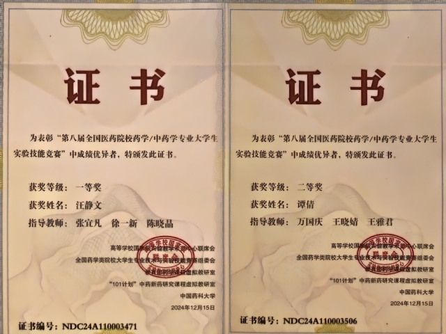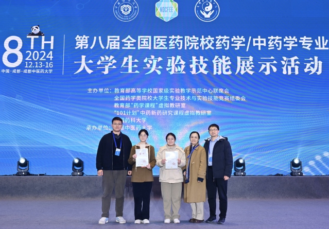 12月13-15日,由教育部高等学校国家级实验教学示范中心联席会、全国药学类院校大学生专业技术与实验技能竞赛组委会、教育部药学课程虚拟教研室、101计划中药新药研究课程虚拟教研室、中国药科大学联合主办,成都中医药大学承办的“第八届全国医药院校药学/中药学专业大学生实验技能大赛”在四川成都落下帷幕。新葡的京官网由新葡的京集团8814检测站副院长孟祥国带队,指导教师代表张宜凡、万国庆随队,遴选2名优秀学子汪静文、谭倩参加此次技能展示并首次获全国一等奖1人,二等奖1人,实现了新的突破!