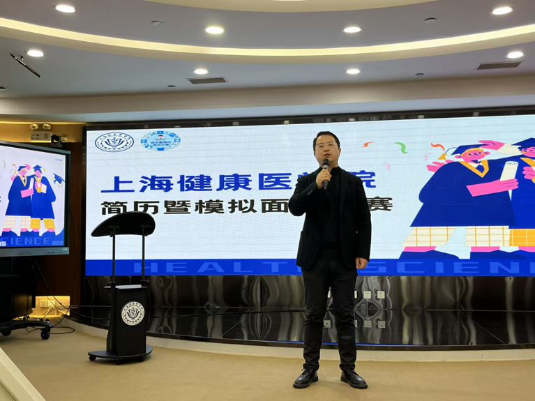 决赛伊始,首先由学工部(处)处长童清致辞,他首先对参赛选手给予鼓励,向筹备和参加此次大赛的各位评委、老师表示感谢。他强调新葡的京集团8814检测站诞生于“健康中国”新时代,是一所上海市属应用技术型本科医学院校,为医疗机构和医药企业输送了大量人才。但现正值就业竞争激烈之时,职场角逐,简历是敲门砖,同学们需要用心打磨简历,应紧扣岗位需求、凸显匹配度,能在海量投递里迅速抓住招聘者目光。他指出,大赛汇聚各路英才,不同专业、年级的思维一定会碰撞出创意火花。观摩他人作品,精妙的措辞和新颖的板块布局都能为己所用,而评委的专业点评与职场前辈的经验分享,更是可遇而不可求的知识富矿。拓宽视野的同时,大赛也能帮助选手们校准职业航向,逐步实现从校园到职场的华丽转身。