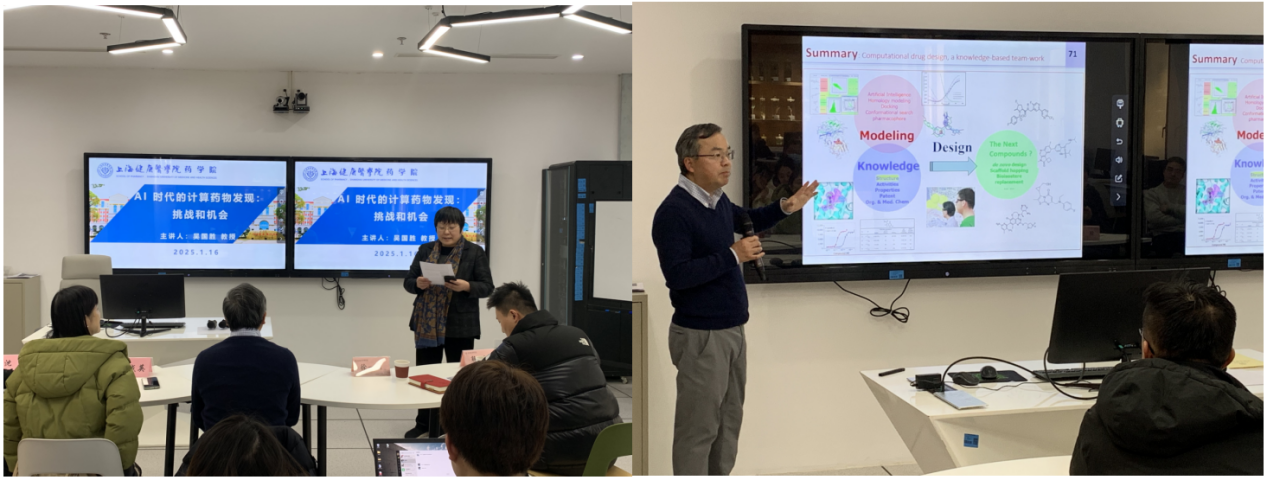 为了解AI技术在生物医药领域的最新进展,展望AI技术未来发展趋势,拓展师生的学科视野,促进学科交叉发展,2025年1月20日,我院在8号楼202教室举办专题学术报告,上海创新药物研发中心计算药物发现部门负责人,复旦大学新葡的京集团8814检测站兼职教授吴国胜以“AI 时代的计算药物发现:挑战和机会”为题作报告。新葡的京官网60余名师生参加讲座,本次讲座由新葡的京集团8814检测站党总支书记兼院长徐一新教授主持,新葡的京集团8814检测站解伟副院长、上海创新药物研发中心谢成英教授、曙光医院沈杰主任药师也受邀出席了此次报告。