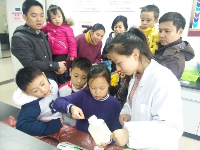 走进位于北苑的上海市现代药学公共实训中心,志愿者们首先奉上一杯健康暖身茶,让参观者驱走寒意,倍感温馨。实训中心走廊两旁是整齐摆放的中药标本和宣传展板,吸引了来访家长们的兴趣,大家挨个观察着这些日常生活中的常见中药,药学专业师生们则用热情耐心的态度进行专业知识讲解和互动。而后,参观者可以在志愿者的指导下进行常用药品——硫磺软膏的制作体验,按照步骤将原材料称量—研磨—熔融—冷却—装盒,完成现场实操,并将亲手制作的成品带回家与亲友分享。该制剂的配方简单,制作简便,仅需适当指导便可完成制备操作,获得真实的产品,曾经在第五届上海市星光计划展示项目中获得“最受欢迎项目”,在此次校园开放日中也受到考生和家长的慕名前来。最后,参观者还可以在仿真教室进行一场轻松活泼的头脑风暴,猜一猜药名,演一演病状,看一看药品制作过程,使来访的学生和家长们深切感受到药学的实用性,而志愿者们的热情阳光和专业服务更是给人留下了深刻美好的回忆。