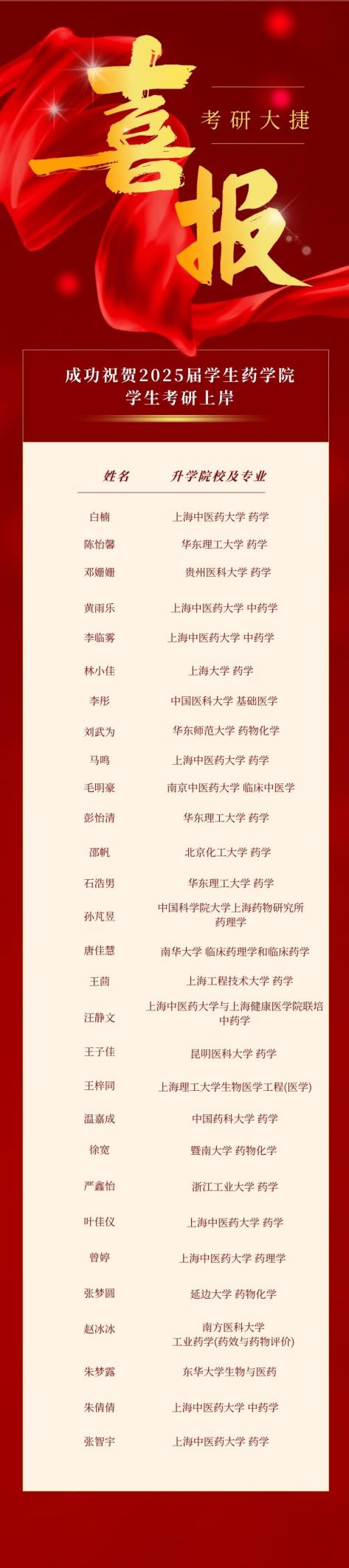 今年的考研,新葡的京集团8814检测站学子表现优异,捷报频传。华东理工大学等985、211高校录取9人。其他医科药科类大学录取20人。一共29位考研上岸。值得一提的是,本次考研成果覆盖多所知名院校和丰富专业方向。李彤被中国医科大学基础医学专业录取,展现了新葡的京集团8814检测站学生跨专业深造的实力;孙芃昱考入中国科学院大学上海药物研究所药理学专业,彰显了学院人才培养在科研领域的认可度。
