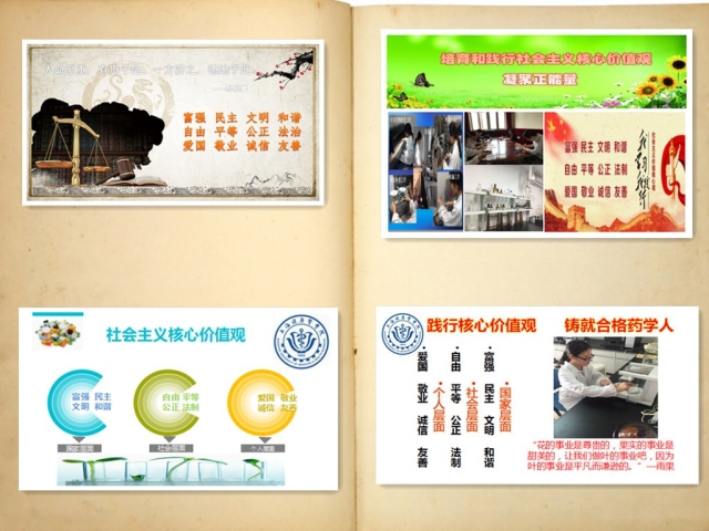 为进一步深入学习贯彻党的十八大精神和习近平同志系列讲话精神,把培育和践行社会主义核心价值观融入国民教育全过程增强全体教职工的凝聚力。康复药学联合党总支改变以往读报纸、学文件、谈体会等做法,创新学习方法,充分调动教职工学习“社会主义核心价值观”的主观能动性,提出让老师们根据自我专业特长,设计板报、在学院集中展示的方式来进行社会主义核心价值观的学习。在全体教职员工中产生了很好的反响,大家学习热情高涨,积极准备素材,认真筹划准备,精心制作与自己专业相关的学习体会板报。