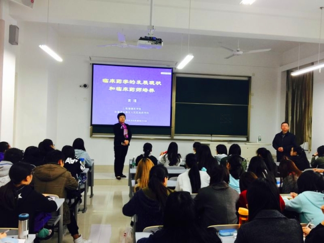 黄璟主任就医院药学发展的三个阶段,药师在医疗卫生事业中的作用,专职临床药师的培养三个方面展开深入讲解。黄主任讲到药师至少应承担三方面的责任:包括当前和潜在的药学相关问题,解决当前药物相关问题,预防潜在药物问题。黄主任引导同学们:“我们应进一步强化为临床服务,以病人为中心的思想。我们应提供负责的药物治疗,实现改善病人生活质量的既定目标。”通过黄主任深入浅出的讲解,同学们深刻了解到,发展临床药学的关键是人才,尤其是合格的临床药师,但目前我国医院药学专业队伍中缺少一支高层次、医药结合型和有实践经验的临床药师队伍。