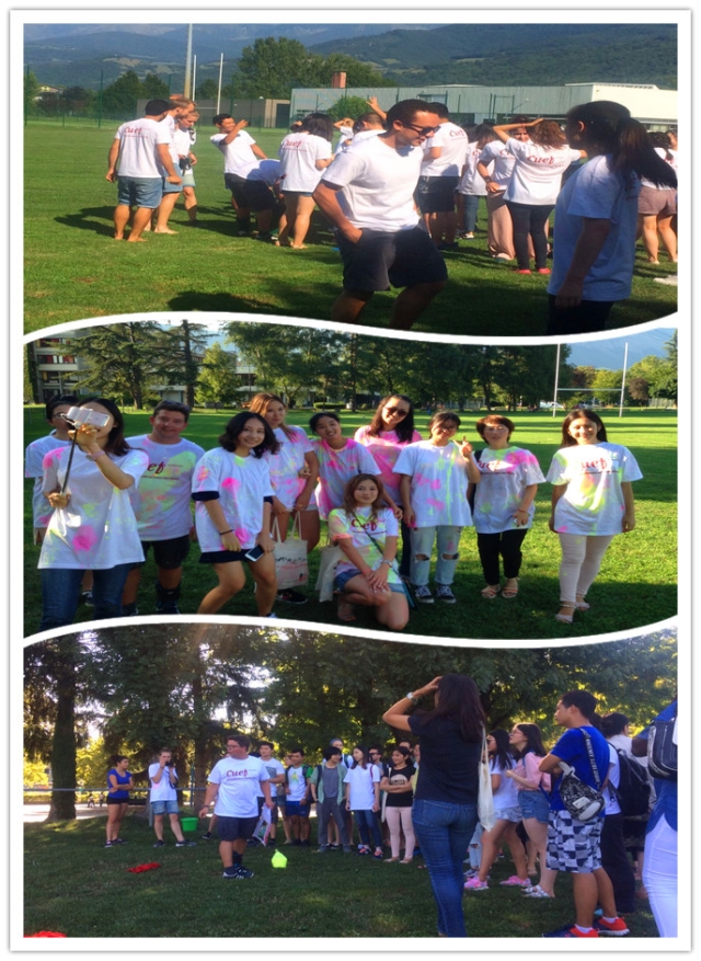 CUEF每周四下午四点半都会为在校生举办了各式校园活动。本周四又是一场别开生面的游戏。自行报名、领取服装、海绵和颜料桶,分为红黄两队。游戏开始每人手持含颜料的海绵,砸向对方,被砸中者原地停滞。其余队员尽力夺取敌方阵营中己方的旗帜,一路困难重重,夺回旗帜队为胜。在这欢快的追逐中,输赢已经不重要,真正留存于心的是彼此间互相配合、共同作战的美好回忆。